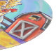 Animal Parade Le poulet apporté par ITD Animal Parade vous présente notre art original d'un mignon poulet jaune et doré debout dans une tanière devant une grange rouge et une clôture avec un ciel bleu texturé avec une bordure violette ondulée ludique. Peint par notre talentueux artiste pour enfants, Traci Van Wagoner.