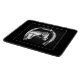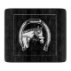 Image d'un tableau à rayures noir et blanc illustrant un cheval de race Thoroughbred portant une bride avec un rouleau d'ombre à l'intérieur d'un fer à cheval. Ce dessin a été gravé dans de l'encre d'Inde sur du carton.