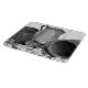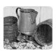 Une planche à découper noire et blanche avec des articles de mère patrie tels qu'un tamis, un pot de thé, un baril en bois et une râpe de viande. Une planche à découper mignonne pour le thème de pays dans votre cuisine.