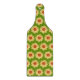 Coupez et découpez votre nourriture en toute sécurité sur cette planche à pagaie, en verre, avec l'image d'une fleur jaune Dahlia imprimée en motif extensible sur un arrière - plan vert citron. Un design floral et amusant ! Une taille idéale pour servir des échantillons de fruits et de fromage !