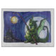 Si vous aimez les dragons, vous aimerez cette amusante oeuvre de Dragon Watch peinte par Traci Van Wagoner. Cette illustration imaginaire représente un dragon vert tenant une lanterne en papier jaune à la silhouette nocturne contre une pleine lune avec un château derrière. En allant jusqu'au château en arrière - plan se trouve une ligne de dragons transportant des lanternes. J'adore les dragons, les scènes nocturnes, et l'idée de dragons sur la garde. Les dragons dominent !
