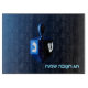 Un rêve moderniste bleu métallique contre un arrière - plan sombre et nocturne. Deux des lettres hébraïques trouvées sur un dreidel, une nonne et un shin, brillent brillamment. Le texte hébreu "Chag Chanukkah Sameach" (Hanoukka heureuse) apparaît également en bleu et blanc éclatant.