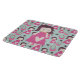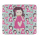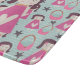 Filles et sacs à main autocollants de conception, ornements, cartes, coussins, horloges murales, ouvre-bouteilles, planches à découper, carnets, montres, portefeuilles, planches à effacement sec, et beaucoup d'autres objets avec un design mignon avec des filles en robes de coeur rose, poches potées roses et blanches, étoiles violettes profondes, et un arrière - plan rayé de chevron bleu.