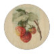 Une illustration d'un groupe de trois fraises sous un certain feuille vert, sur une crème foncée ou un arrière - plan beige, d'une peinture vintage par l'artiste Catharina ou Catherine Klein, né 1861.