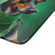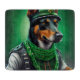 Un ami en fureur derrière les guidons d'une moto verte brillante, portant une tenue verte de la Saint Patrick qui fait tourner la tête. Le chien est habillé d'un ensemble festif, avec une cravate arc-en-ciel verte et un chapeau haut assorti qui se trouve doucement au-dessus de la tête. Le costume présente des motifs complexes de shamrocks et de leprechauns, ce qui indique clairement que ce chien est prêt à célébrer la Saint Patrick avec style.