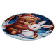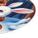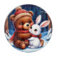 Illustration d'un ours en peluche gai qui cagoule un lapin pendant une nuit d'hiver enneigée, entouré de décorations festives et d'un train de jouets coloré.