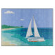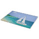 Monogram Voilier Coastal Tropical Cutting Board. Un voilier avec votre nom sur elle s'approche d'une plage. Vue sur la mer tropicale. Bleu, turquoise, mousse de mer, turquoise, vert, blanc.
