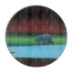 Un ours polaire arpente la glace pendant la longue nuit polaire; les aurores boréales en rouge et vert au loin.