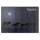 Une nuit d'hiver froide et illuminée par la lune; un sac à loup sur le rôti. Le texte "Alaska" apparaît en bleu et blanc brillant.