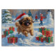 Un Pekingese moelleux traverse joyeusement le paysage enneigé, portant un casquette de Noël rouge festif. Cette charmante scène hivernale met en valeur la personnalité regale mais joueuse de la race, capturant la chaleur et l'esprit de la saison des fêtes. Un design charmant et festif.
