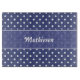 Un motif de point de polka de bleu marine et de blanc est l'arrière - plan pour votre nom dans le blanc sur une bannière semi transparente foncée de marine. La bannière est rayée en haut et inférieur avec les frontières blanches minces. Attrayant, audacieux, et distinctif pour votre cuisine !