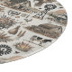 Une scène agricole vintage avec un moulin à vent, une maison de ranch, blé, vaches, poulets et roues de wagon.