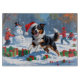 Illustration de vacances pleine de charme avec un chien gai jouant dans la neige, portant un chapeau de Père Noël et entouré de boîtes cadeaux colorées. Dans l'arrière - plan, les enfants construisent un bonhomme de neige à côté d'un sapin de Noël enneigé, créant un merveilleux pays hivernal. Parfait pour répandre la joie des fêtes et capturer la magie de Noël.
