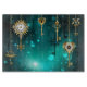 Or, clés antiques avec engrenages et cadrans accrochés sur chaînes dorées sur arrière - plan vert lumineux.