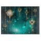 Or, clés antiques avec engrenages et cadrans accrochés sur chaînes dorées sur arrière - plan vert lumineux.
