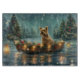 Jetez un coup d'oeil à la magie de la saison des Fêtes avec cette illustration magnifiquement détaillée, montrant un chien fier assis dans un bateau à la décoration festive, glissant à travers un lac serein de Noël. Les lumières scintillantes des pins voisins se reflètent dans l'eau, projetant une lumière chaude et festive qui renforce l'ambiance cosy. Des ornements pendent des côtés du bateau, tandis que des lanternes brillantes éclairent le chemin, créant une scène qui capture l'essence véritable de la chaleur et de la joie de Noël. Cette oeuvre nostalgique apporte une touche de magie de vacances à tout espace, parfait pour ceux qui chérissent l'esprit de la saison.