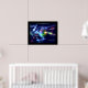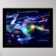 Poster with my digital artwork of the planet Earth in space surrounded by colourful auroras, stars and music notes with text "the day the Earth stops singing, we stop dancing".