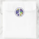 Painting of a beautiful earth with colourful flowers, is a backdrop for a peace sign, printed on stickers.