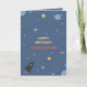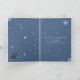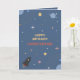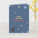 Une carte de voeux d'anniversaire thématique espace avec des planètes, des étoiles et une fusée en dessin animé sur un arrière - plan bleu. Les textes sont personnalisables : parfait pour envoyer à un enfant, ou pour accompagner un cadeau !