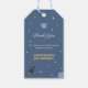 Une étiquette de remerciement de fête d'anniversaire sur le thème de l'espace avec des planètes, des étoiles et une fusée dans un style cartoon sur un fond bleu. Vous pouvez facilement l'utiliser pour remercier les invités d'une fête ou pour tout cadeau que vous réaliserez !