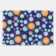 Wrapping paper with a First Trip Around The Sun theme for a 1st birthday party. These coordinate with the other outer space themed decor for celestial galaxy parties. These sheets have a blue planets and sun theme with assorted colours backgrounds. There are additional background colours available in this collection.