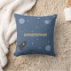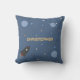 A space themed Pillow for kids room decoration with planets, stars and a rocket in cartoon style on a blue background. It comes with a customizable forename: perfect for a gift!