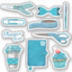 Bow clips, scissors, cupcake, takeaway coffee, planner, washi tape, pen, and lots of blue glitters.