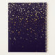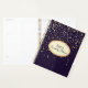 This planner notebook is shown with marigold petite stars print on a eggplant purple background. Personalized name for you to customize to yours inside an ivory oval with dual coordinating coloured borders of marigold and mulberry on the front. Back same colour and petite stars print. Text is in eggplant purple. Select your binder spiral on the side, this one is shown with gold.