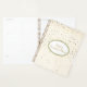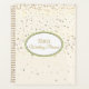This planner notebook is shown with a petite Champagne stars print on a Ivory coloured background. Personalized name for you to customize to yours inside a white oval with dual coordinating coloured borders on the front of Fern green and Latte, matte gold text. Back same colour and stars print.