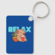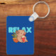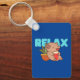 This adorable keychain features a cartoon capybara sitting in an orange pot next to a green plant. The capybara is holding a red book and appears content, with the word “RELAX” above it in bold, light blue letters. This keychain is perfect for capybara lovers and those who enjoy a relaxed, bookish vibe. Made from high-quality materials, it’s a delightful and durable accessory for your keys, bag, or backpack.