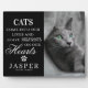 Cette plaque commémorative pour animal de compagnie élégante comportant une photo de votre animal de compagnie bien-aimé est un beau souvenir pour vous et votre famille pour chérir ou ferait un cadeau sincère. Elle comporte une citation de condoléances qui dit "Les CHATS entrent dans nos vies et laissent des empreintes de pattes sur nos Cœurs", une empreinte de patte avec un cœur centré, le nom de votre animal de compagnie et les dates.