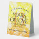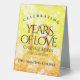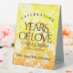 Ajoutez une touche spéciale aux célébrations du 13e anniversaire de mariage avec cette élégante tente de table ! Un lettrage élégant avec des confettis hexagonaux sur un arrière - plan en mosaïque jaune-orange apporte une touche inoubliable pour cette occasion spéciale et cette étape importante. Customisez avec les noms des couples, les dates du mariage et les messages de félicitations. Remarque : cette conception a été optimisée pour une utilisation verticale du portrait. Design © W.H. Sim. Voir plus sur zazzle.com/expressionsoccasions