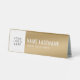 Personnalisez ce professionnel simple élégant panneau de table en or Faux avec des lettres blanches. Veuillez noter que l'or est un imprimé de couleur beige plat et n'est pas une feuille d'or ou une couleur réelle. L'effet brillant est aussi un effet d'impression couleur plat. Remplacez "your logo here" image par une image de votre logo, ajoutez votre nom, nom et titre et vous obtiendrez un panneau de nom minimaliste et moderne. Toutes les informations sont des deux côtés de ce panneau de design propre. Pour redimensionner ou déplacer votre image logo, appuyez sur le bouton "Customiser". Vous pouvez également contacter le concepteur pour le faire pour vous ou pour un plus grand nombre de plaques d'identification, sans frais supplémentaires. Idéal pour les entreprises, les entreprises, les bureaux, pour tous les employés.