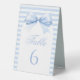 Élégant classique preppy baby boy numéro de table de douche sur le panneau de tente de table montrant mignon bébé bleu arc sur l'arche bohème et motif rayé à l'arrière. Parfait pour la célébration douce bébé garçon dans le thème coquette.