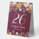 Les cartes de numéro de table de mariage de style romantique rustique présentent un monogramme élégant avec des chiffres encadrés par une aquarelle fleurie avec de beaux roses, dahlias, des fleurs de pivoines et de la verdure, dans une magnifique palette automnale de rouge bordeaux, jaune doré, orange pêche, rose roux et tons verts. Riche couleur arrière - plan rouge bordeaux.