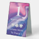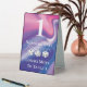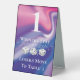 Une façon amusante et moderne de guider les joueurs de Bunco de table en table. Arrière - plan holographique rose et violet. Trois dés Bunco ou Bunko de chance blanc. Les gagnants restent et les perdants passent au tableau 3.