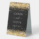 Une couleur de fond noir. Décoré de confettis en or faux. Avec le texte : Cartes et cadeaux, merci !