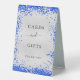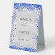 Un faux arrière - plan argenté, décoré de confettis bleu roi, brille. Texte noir. Avec le texte : Cartes et cadeaux. Merci!