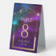 Celestial Purple Teal Gold Sun Moon Astronomy Wedding Table Numbers Paper Table Tent Sign features gold sun, moon and stars with a golden frame on colorful celestial purple, teal and blue cosmic background. Inside is your custom table number information. Designed for you by Evco Studio www.zazzle.com/store/evcostudio