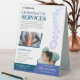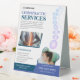 Utilisez les deux côtés de la tente de table pour afficher des informations différentes, comme une liste de services d'un côté et des offres spéciales ou des conseils de bien-être de l'autre.