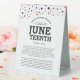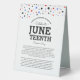 Célébrez la fête du 11 juin ! Ces tentes de table ont un design minimaliste mais significatif sur le thème de la junte. Au sommet se trouve un amas d'étoiles représentant les États-Unis. Au lieu de cela, ces étoiles sont dans une palette de couleurs rouge, noir et bleu. En-dessous, vous trouverez votre message unique sur ce que signifie pour vous le 19ème jour férié.  Un excellent outil éducatif pour enseigner aux gens plus sur la fête du 18 juin.