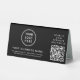 Panneau de socle de table moderne noir pour votre entreprise avec votre code QR pour que les clients scannent pour le paiement ou pour afficher une liste de vos produits, services et prix ou d'autres informations. Ajoutez votre logo, nom d'entreprise, code QR, numéro de téléphone et adresse (ou d'autres informations) en typographie blanche simple.