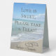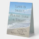 L'amour est doux, s'il vous plaît prenez un soin! Signez pour demander aux clients mariages de prendre une faveur, un régal, une menthe, un bonbon ou un dessert. Coeurs pittoresques dans l'image de plage de sable, pour des visions de relaxation dans le paradis, célébrer votre mariage de plage avec ce design charmant. Deux coeurs enchevêtrés tirés dans le sable de plage sur la côte océanique, parfait pour une destination, île, paradis tropical événement nautique côtier. Sable bleu turquoise et bronzé avec vagues blanches qui s'écrasent sur le rivage.