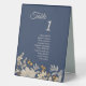 Ce panneau de tente de table Boho d'automne bleu Dusty combine une ambiance antique et un style bohème rétro fleur sauvage. Les élégants fleurs sauvages beiges neutres, en plus de l'arrière - plan bleu poussiéreux, marine, avec sa typographie calligraphique classe, permettent un thème formel mais sauvage et fleuri, style vintage de célébration du mariage.