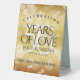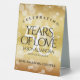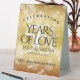 Ajoutez une touche spéciale aux célébrations du 50e anniversaire de mariage d'or avec ce panneau de table élégant ! Des lettres élégantes avec des confettis hexagonaux sur un arrière - plan de feuille d'or ajoutent une touche mémorable à cette occasion spéciale et à ce jalon extraordinaire. Customisez avec les noms des couples, les dates du mariage et les messages de félicitations. Remarque : cette conception a été optimisée pour une utilisation verticale du portrait. Design © W.H. Sim. Voir plus sur zazzle.com/expressionsoccasions