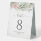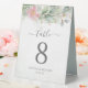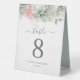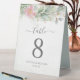 Beaux numéros de table mariage avec des eucalyptus couleur rose vif et feuilles d'or.
