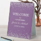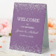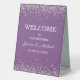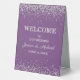 Élégant violet avec mariage de parties scintillant argent "Bienvenue" panneau de table avec le texte, "Bienvenue à notre mariage." Personnalisé avec les noms de la mariée et du marié et leur date mariage.