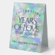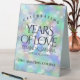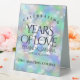 Ajoutez une touche spéciale aux célébrations du 34ème anniversaire du mariage de l'opal avec ce panneau de table élégant ! Des lettres élégantes avec des confettis hexagonaux sur un arrière - plan opal iridescent ajoutent une touche mémorable à cette occasion spéciale et à ce jalon extraordinaire. Customisez avec les noms des couples, les dates du mariage et les messages de félicitations. Remarque : cette conception a été optimisée pour une utilisation verticale du portrait. Design © W.H. Sim. Voir plus sur zazzle.com/expressionsoccasions
