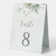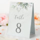 De beaux numéros de table mariage avec des eucalyptus aquarelles et des feuilles d'or.