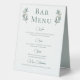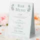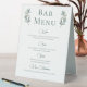 Un script de calligraphie verte simple et élégant avec deux feuilles d'eucalyptus d'aquarelle de chaque côté en haut autour du titre du menu du bar. Une belle affiche minimaliste de la carte des boissons d'automne avec votre liste détaillée de vin, bière, spiritueux et boissons non alcoolisées. Décor chic et moderne mariage du soir pour un jardin en soirée.